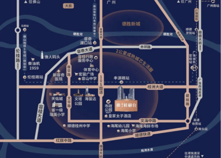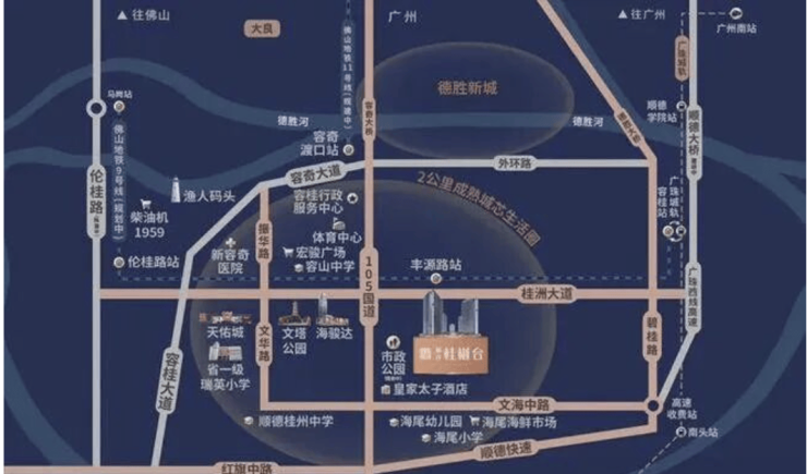 桂樾台项目享有完善的多维交通网络,保障业主高效出行。项目周边通过顺德大道南(G105国道)和桂洲大道快速连接大良及容桂各板块,形成畅达的市内交通体系。市际交通方面,临近多条高速公路,实现顺德与广佛地区的自由切换,为通勤及商务出行提供便捷条件。同时,项目距离地铁容桂站仅数分钟车程,未来随着广佛地铁网络扩展,将进一步提升居民通勤便利性。三高速、三地铁及一城轨的多维交通布局,使业主在广佛同城及大湾区内出行更加高效灵活,无论是工作通勤还是休闲旅游都能够轻松实现。交通便利性不仅提升了生活效率,同时为项目带来持续增值潜力,强化了桂樾台作为核心宜居项目的吸引力。
