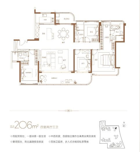 此外,项目还规划有207方四房两厅三卫的大户型产品,适配改善型家庭居住。该户型空间开阔,布局奢华,配备三个卫生间,充分保障家庭成员的使用需求;客厅采用大面宽设计,连接观景阳台,可俯瞰社区园林与外部自然景观,提升居住的舒适度与品质感;卧室均配备独立衣帽间与卫生间,私密性强,让每一位家庭成员都能享受专属的舒适空间。