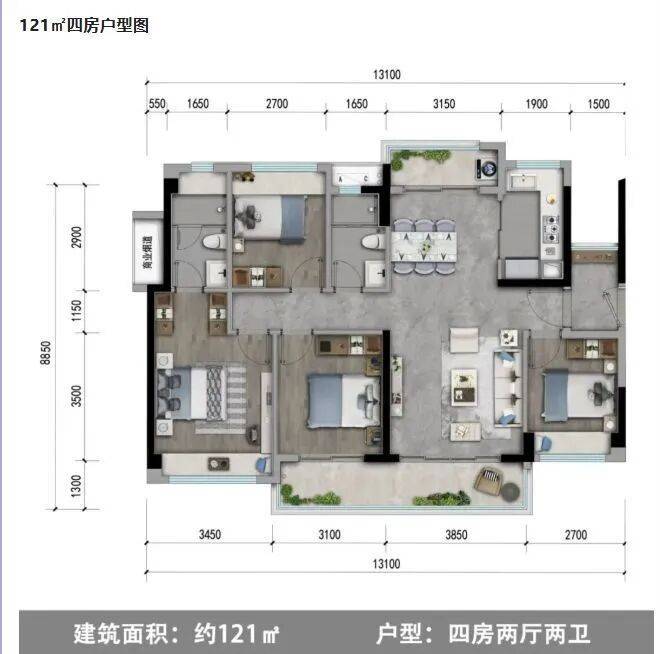 当前加推的新规户型在原有基础上进一步优化了空间利用率。以主力产品95㎡三房为例,采用南北通透格局,客厅连接宽景阳台,主卧配备独立卫浴与飘窗,整体得房率高于同区域多数竞品。121㎡四房则通过动静分区设计,将卧室集中于一侧,公共活动区集中在另一侧,减少相互干扰。值得一提的是,所有住宅产品均为带装修交付,厨房配置品牌橱柜与抽油烟机,卫生间采用干湿分离设计,部分楼栋高层单位还能俯瞰滨江景观带,视野开阔。