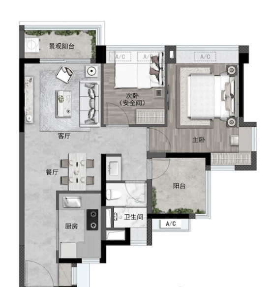 建面约 115㎡三房两厅两卫 + 百变空间:横厅设计,客厅面宽达 6.2 米,景观阳台面宽约 5.5 米,连接次卧,得房率约 98%,居住体验极佳。