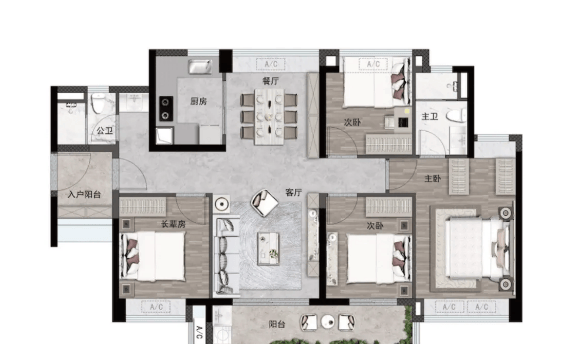 建面约 105㎡三房两厅两卫 + 百变空间:横厅布局,客厅面宽约 6 米,主卧面宽约 4 米,赠送 8 处飘窗,空间宽敞,适合改善家庭;
