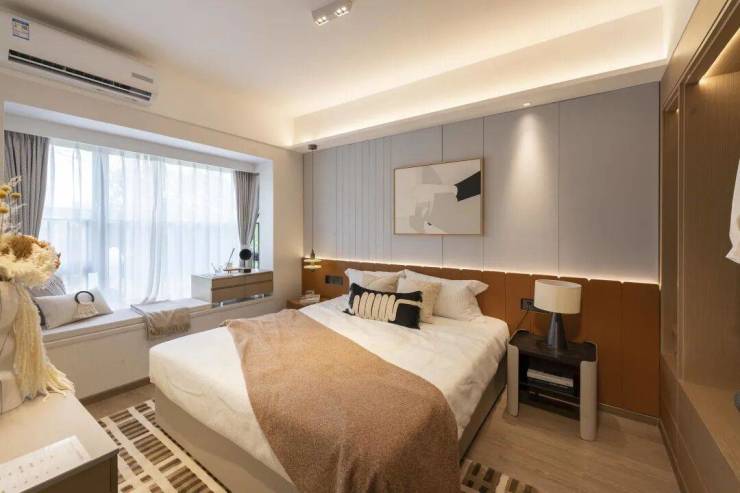 双飘窗设计,主卧宽敞明亮,配有嵌入式大衣柜。