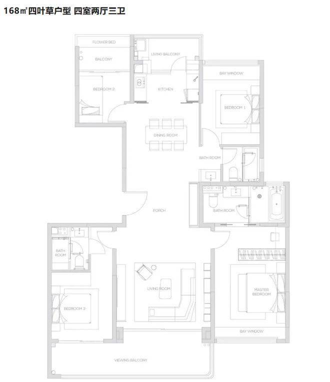 户型设计以舒适与品质为核心。所有楼栋为 16 - 17 层纯板式小高层,专梯专户,保证居住的低密舒适。虽不是新规后的产品,但户型设计注重空间利用与居住体验。如 168㎡四叶草户型,四室两厅三卫,搭配【M + 科技系统】,从空气、饮水、环境等核心要素出发,采用优质材料与工艺,满足现代智慧社区与智能生活需求,为业主打造绿色健康的居住空间。