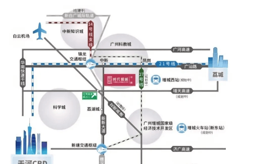 时代倾城位于增城区中新板块,地理位置优越,距离黄埔仅 1.5 公里,轻松享受跨区资源辐射。交通出行方面,项目距离地铁 21 号线中新站约 1.7 公里,可通过如约巴士或公交快速接驳,搭乘 21 号线能便捷抵达广州东部各区域。高速路网同样便捷,花莞高速已通车,可快速直达知识城、科学城;增天高速预计 2025 年通车,未来到天河核心区仅需 20 分钟左右,大幅提升通勤效率,无论是日常上班还是跨区出行都十分方便。