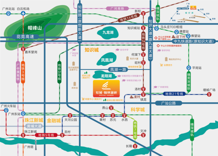 项目内部设有2000+㎡的新知城商业体,满足日常购物需求。周边更有绿地缤纷城、合景悠方广场等大型商业综合体,集吃喝玩乐于一体。医疗方面,临近中山大学第六附属分院、中山大学附属肿瘤医院等多所三甲医院。同时,项目尊享一线湖居生活,龙翔湖调蓄面积达152669平方米,周边还有智慧图书馆和双公园,为居民提供了丰富的休闲娱乐选择。