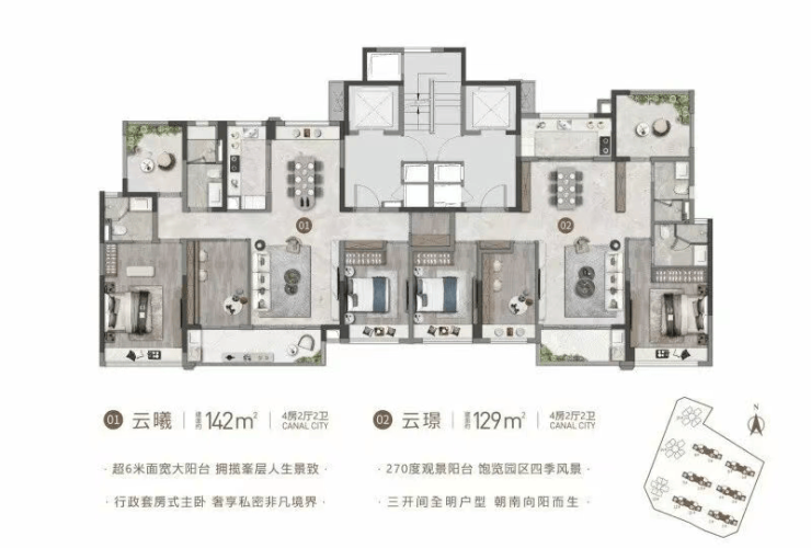129㎡“云璟”四房:南向四开间、270°瞰景阳台、开放式餐厨,适合改善家庭;