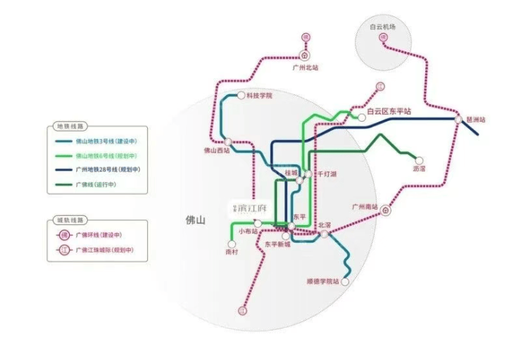 华发滨江府坐拥“三横四纵五地铁+双城轨”的立体交通网络,虽目前最近地铁站(广佛线小布站)距离约1.5公里,需依赖社区接驳巴士,但整体通勤效率仍处区域前列。通过广佛地铁1号线,3站直达广州南站,5站抵达琶洲会展中心;在建的广佛环线将于2026年全线贯通,届时小布村设站将极大提升项目轨交便利性。此外,佛山6号线(规划中)也将在此交汇,形成双轨交汇潜力。地面交通方面,项目紧邻佛山大道、岭南大道等城市主干道,10分钟内可通达禅城核心区、乐从商圈及顺德区政府。对于广佛双城生活族而言,无论是自驾还是公共交通,华发滨江府都提供了高效且多元的出行选择。