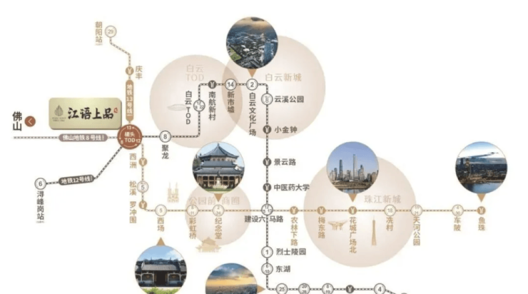 交通升级:项目为12号线西洲站上盖盘(已通车),4站直达荔湾老城区,6站至越秀纪念堂,换乘后10分钟达珠江新城;13号线二期(预计2025年底通车)串联天河公园、冼村等核心板块;佛山8号线(规划)贯通广佛,加速同城化。自驾出行方面,项目紧邻潭涌路(白云二线)与潭溪路(棠槎路),均为双向8车道城市主干道,早高峰打车至白云站仅8分钟,至白云新城核心区15分钟。
