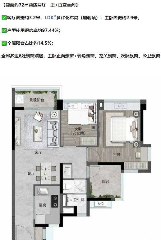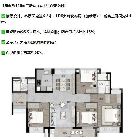 主要户型包括72-133平方米的两至四房,户型布局南北通透,部分户型采用横厅设计,实现客厅及卧室采光最大化。入户花园及景观阳台提升居住体验,百变空间设计满足家庭多功能使用需求。全屋飘窗设计覆盖主卧、次卧、玄关及卫生间,实现室内光照及景观最大化利用。