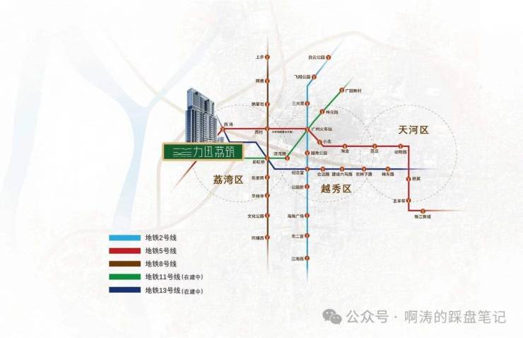 力迅·荔筑构建“双地铁+四横四纵+多维公交”的立体交通网络,无缝衔接全城核心区域,高效通达越秀、天河、海珠等板块,尽享主城便捷通勤。轨道交通方面,项目紧邻**地铁5号线西场站**,步行距离约400米,同时紧邻在建的**地铁13号线二期**,未来将实现双地铁交汇,2站直达越秀,9站抵达珠江新城,7站直达金融城,通勤效率大幅提升。周边直线3公里范围内覆盖17个地铁站,包括西村、彩虹桥、中山八、陈家祠等,轨道交通网络密集,出行选择丰富。道路交通方面,依托东风西路、环市西路、康王路、内环路构成四横四纵主干道路网,自驾可快速通达上下九、北京路、陈家祠等核心商圈,无缝衔接广州全城。公共交通方面,周边直线1公里内有38个公交站,距离最近的和平新村站(西行)仅约110米,十余条公交线路环绕,覆盖全城主要区域,绿色出行便捷无忧。