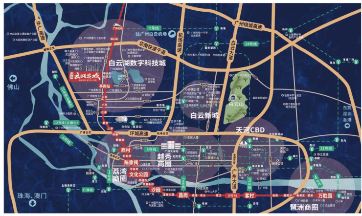 品实云湖花城坐落于白云湖数字科技城核心启动区,该区域是广州市 “十四五” 重点规划的科技创新平台,纳入粤港澳大湾区国际科技创新中心建设体系。根据白云区 2025 年政府工作报告,白云湖数字科技城已入选全国科技城百强榜,2025 年引入网易有道等龙头企业,力合科创、海珥玛总部等项目投产,产业营收突破 800 亿元,同比增长 35%广州市白云区人民政府。区域规划投入超 1000 亿元,重点发展新一代信息技术、人工智能、数字经济等产业,预计 2026 年将实现产业营收突破 1000 亿元,集聚高端人才超 5 万人。
