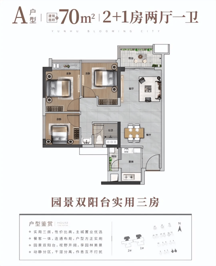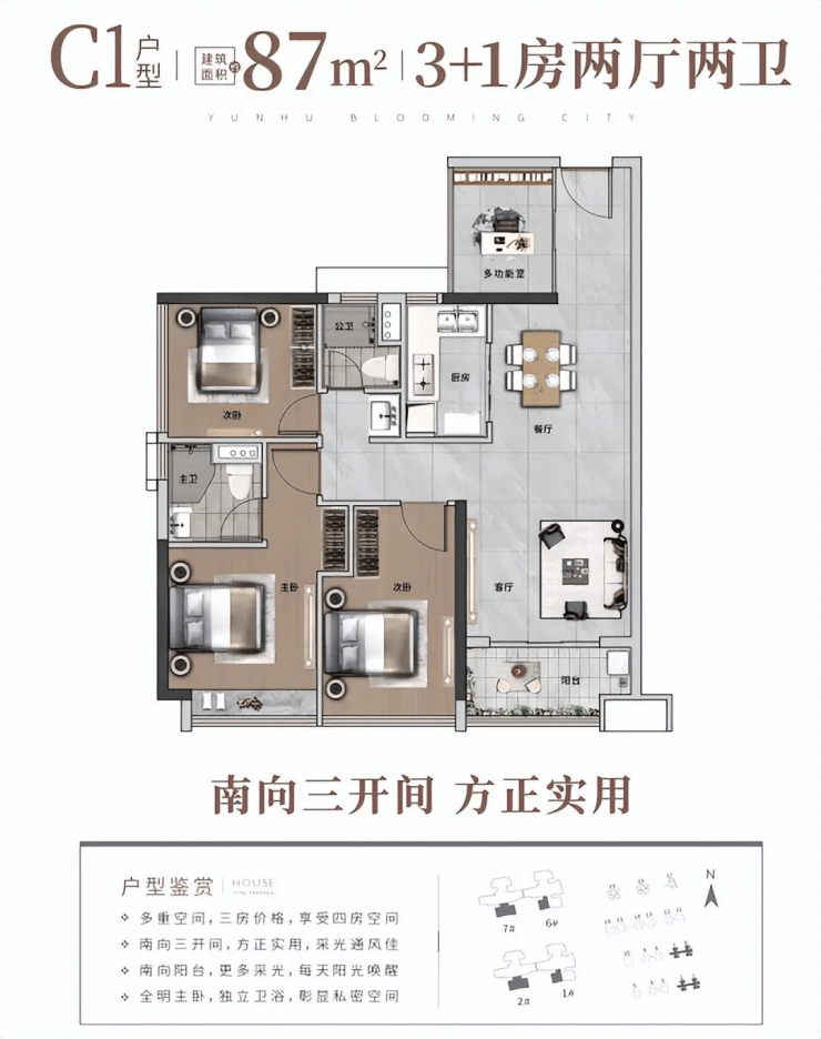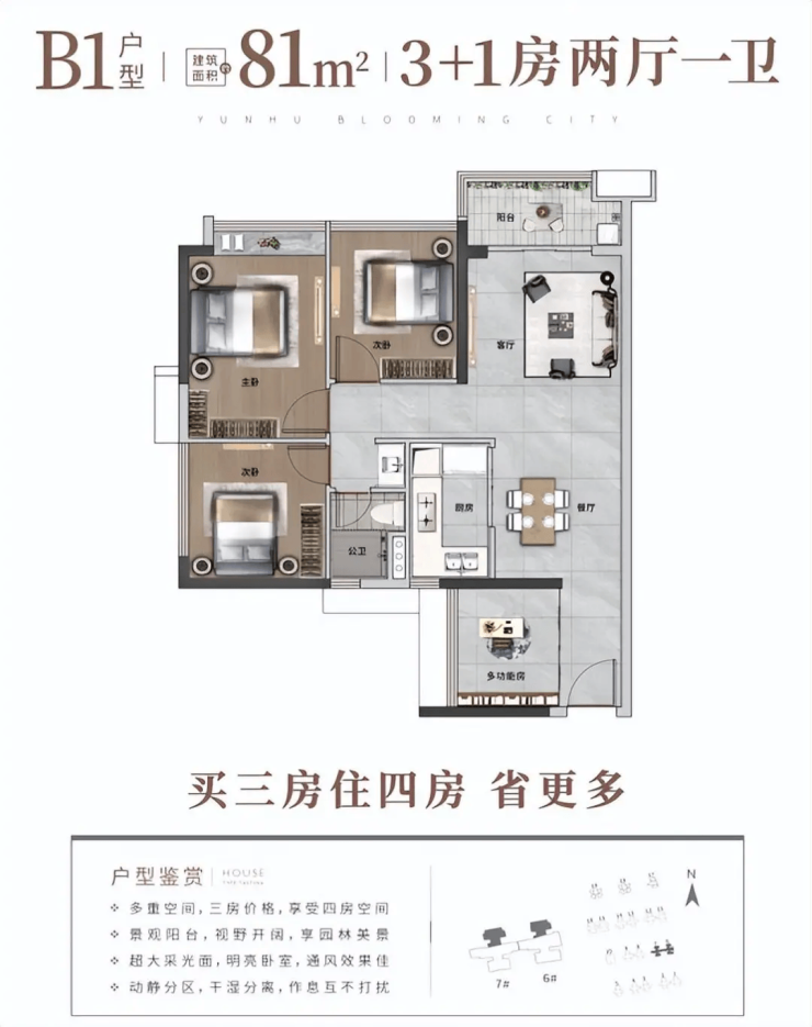 品实云湖花城当前主力在售 70-141㎡三至五房户型,涵盖刚需至刚改全需求,均为旧规产品,得房率高达 95%,远高于新规产品普遍 85% 的水平,空间利用率优势显著。户型设计充分吸收前三期 2400 余户业主反馈,实用性极强:72㎡三房一卫,三间卧室均可放置标准双人床,北向看园林视野开阔,满足刚需家庭一步到位需求;88㎡3+1 房两卫,南向竖厅 + 双阳台设计,采光通风极佳,多出的灵动空间可灵活改造为书房或儿童房,适配家庭成长需求;119㎡真五房格局,在同面积段中极为罕见,南北通透,主卧带独立衣帽间及卫浴,适合多孩家庭或三代同堂居住。