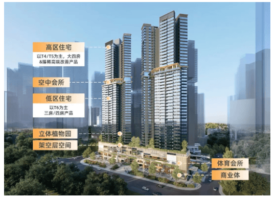 【楼栋规划】:共4栋住宅,分高低区设计,4-28层为低区,30-44层为高区,梯户比低区2T6、高区2T5