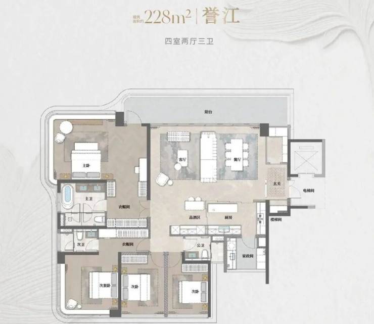 建面约228㎡【誉江】户型:近12米超宽江幕观景台,67㎡LDKB云峯会客厅,三卫设计,适合多代同堂的大家庭。