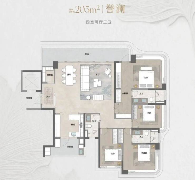 建面约205㎡【誉澜】户型:超10.5米极阔观景台,42㎡LDKB洄游方厅,空间通透感与实用功能平衡。