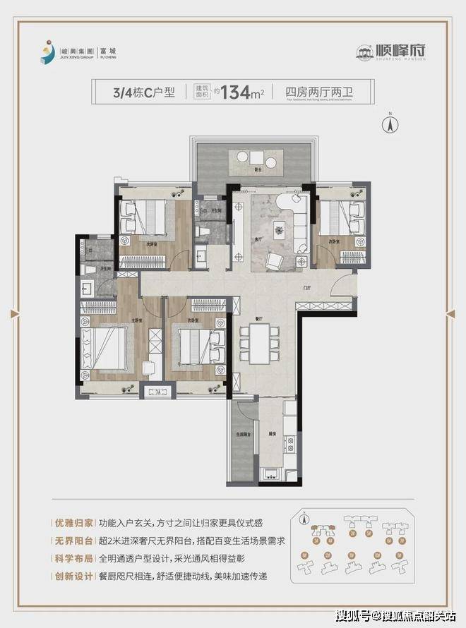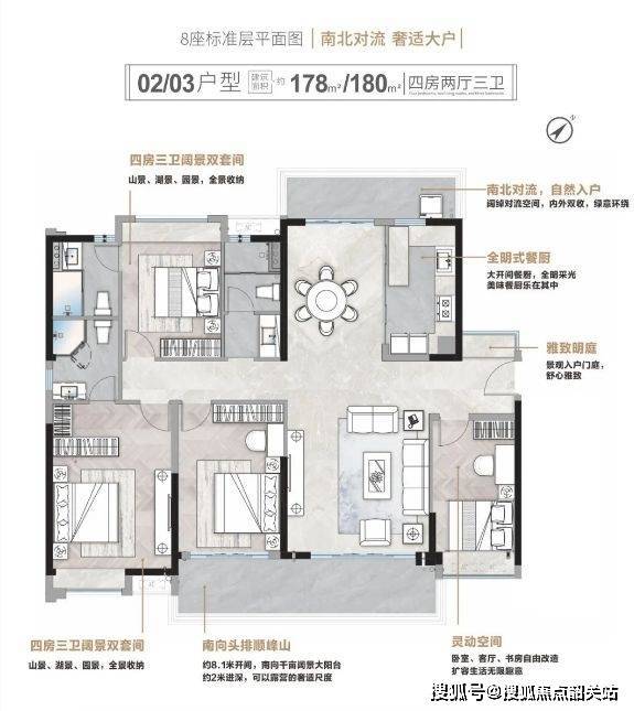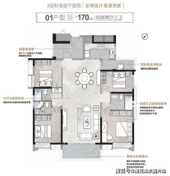 178㎡户型:四房双套房设计,南北对流,主阳台近8米,视野无遮挡。