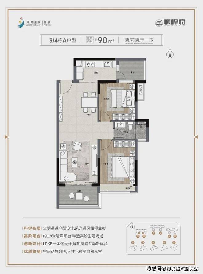 90㎡户型:LDKB一体化设计,全明通透,空间利用率超90%;
