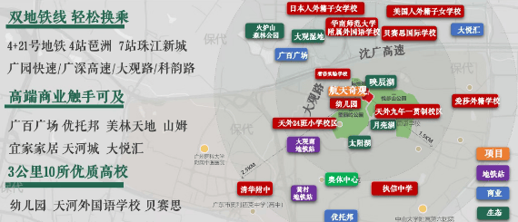虽然距离地铁站有一定距离,但21号线作为天河东部的核心地铁线路,能够快速联动全城核心区域,为业主的日常通勤提供便利。从大观路站出发,乘坐21号线,能够快速到达天河智慧城、科学城等产业板块,也能通过换乘其他地铁线路,到达珠江新城、天河路商圈、广州东站等核心区域,满足业主的通勤、购物、休闲等多种需求。