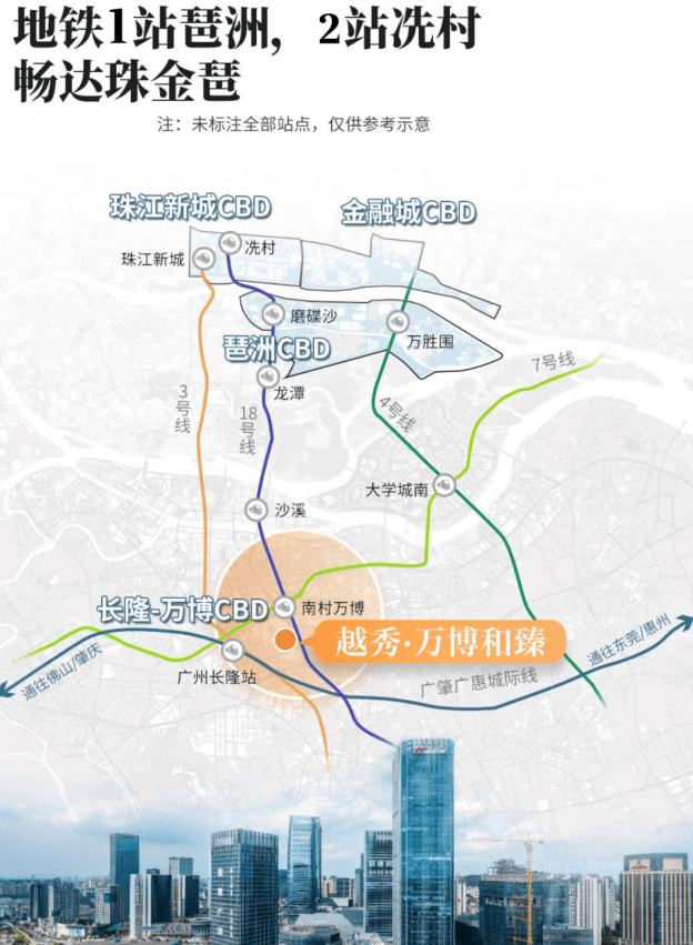 越秀·万博城|和臻位于番禺区的核心地段,靠近南村万博地铁站,该站为7号线及18号线交汇点,便捷连接广州多个重要区域。步行至地铁站约1.3公里,建议业主可选择骑行或电动车接驳以提高出行效率。