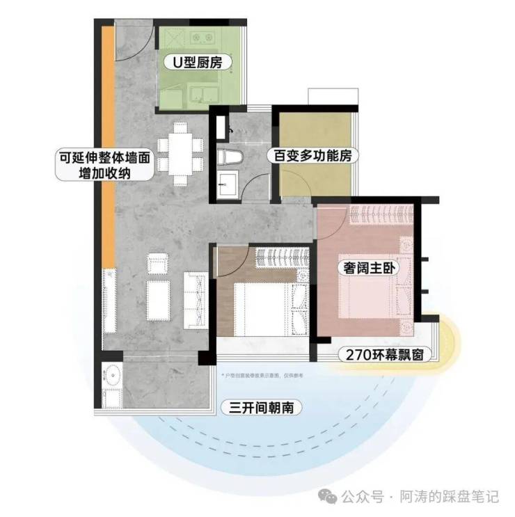 整体价值:6m³整墙收纳+南向9m采光面+5㎡全景厨房+270°景观主卧