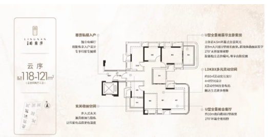 【云序|建面约118-121㎡全景舱五空间两厅三卫】户型在空间尺度与功能配置上全面升级,三卫设计满足多人口家庭日常使用需求,避免早晚洗漱拥挤。双U型全景舱设计搭配270°环幕视野,将自然景观与室内空间完美融合,同时配备家政间、帽鞋区,提升空间利用率与居住便捷性。