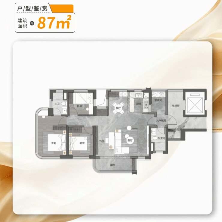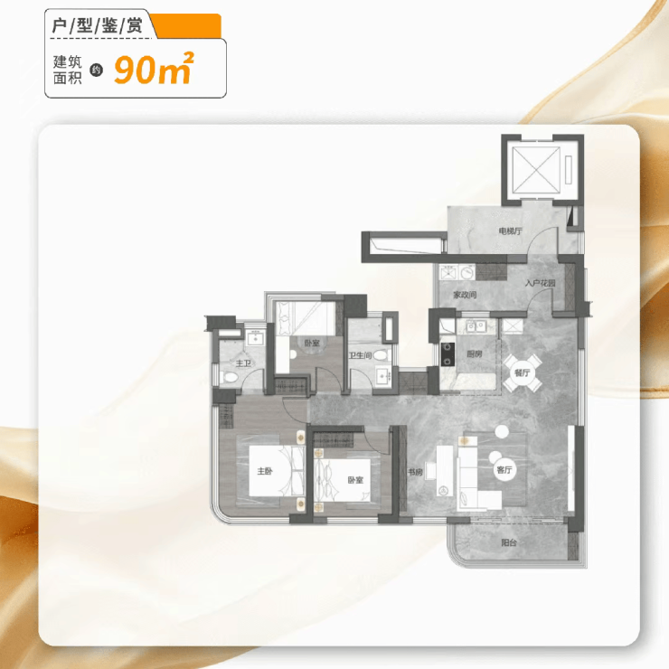 【建面约90㎡户型】采用四开间朝南布局,配备独立电梯厅与270°环幕主卧,采光通风俱佳。空间设计灵动多变,可根据家庭需求调整功能区域,兼顾实用性与舒适度,是改善型家庭的优选户型。