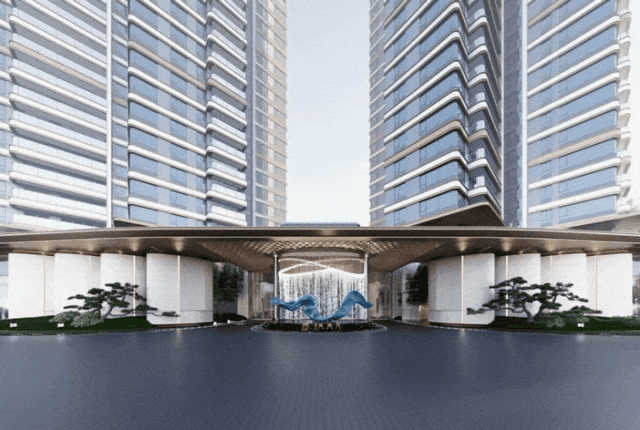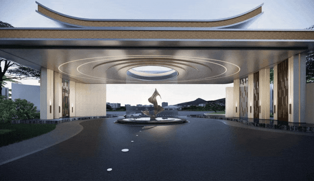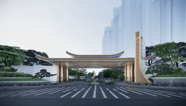 社区入口打造约126米跨度的展示区大门,正门宽约38.5米、顶高约10.8米,采用宋代官帽形制设计,搭配灿金门头、斜飘罗汉松、水景点缀,尽显豪宅气质。入口石材选用意大利定制普拉达绿大理石,经全手工水刀切割、精密拼花、镜面抛光处理,细节之处彰显品质。
