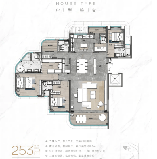 4. 253㎡一线滨江传世大平层:高端豪宅户型,占据一线江景资源,距江不足100米。户型采用大面宽、短进深设计,270°环幕全景落地窗,将珠江之上的城市天际线尽收眼底;主卧套房配备独立卫浴、衣帽间与观景露台,尊享奢华居住体验;客餐厅面积宽敞,可满足大型家庭聚会与社交需求,是塔尖人士的理想居所。