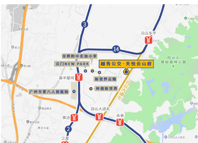 项目位于白云新城盘,开车仅需5分钟便可畅享白云新城商圈的成熟配套。周边有超过200万㎡的繁华商业圈,涵盖云门NEW PARK商场、云悦里广场等多个大型商业广场。此外,三甲医院如广州市第八人民医院、广东省工伤康复医院等也为居民提供了优质的医疗服务保障。