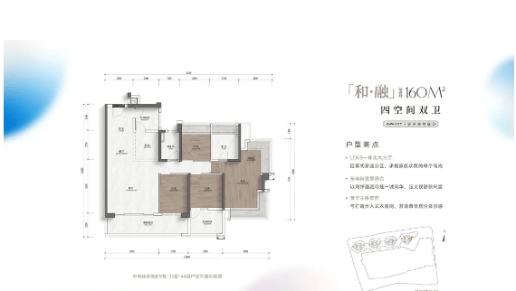 最后是建面约160㎡的四空间双卫户型。这是项目中的旗舰户型,专为追求极致生活品质的家庭打造。LDKB一体化大方厅设计,打破了传统客厅、餐厅、厨房、阳台的界限,形成了一个超大尺度的家庭核心区。东南向的宽景阳台,采光通风俱佳,视野开阔。无论是家庭聚会还是日常起居,都能感受到前所未有的宽敞与大气。这种大平层的居住体验,在亚运城区域内实属罕见。