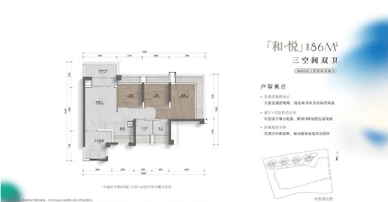 首先来看建面约86㎡的三空间两卫户型。这是一个非常适合三口之家或年轻夫妇的入门级改善户型。其最大亮点在于“大面宽通透格局”,客厅与次卧相连,形成灵动的可变空间,可根据家庭生命周期灵活调整为书房、儿童房或客房。环幕观景主卧的设计,更是让居住者拥有无遮挡的广阔视野,采光与通风俱佳。两个卫生间的配置,有效解决了早高峰抢厕所的尴尬,提升了生活的便利性。
