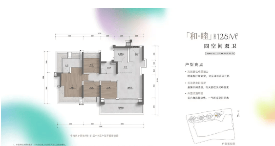 再看建面约128㎡的四空间双卫户型。这是典型的改善型大户型,动静分区明确,空间阔绰。客厅与餐厅的衔接更加紧密,适合举办家庭聚会或朋友聚餐。主卧套房配备独立卫浴与衣帽间,奢华感与实用性并存。大面宽的阳台,让室内外空间无缝融合,无论是种花养草,还是品茶读书,都是极佳的选择。