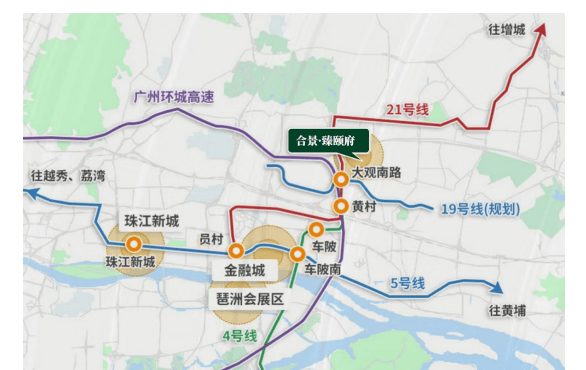 合景臻颐府的交通网络极为便捷,自驾车可轻松实现与珠江新城、智慧城、金融城等中轴核心片区的连接,并可通过白云机场、广州南站与其他城市无缝互联。地铁21号线智慧城站距离项目仅约1.5公里,4号线黄村站约2公里,规划中的19号线大观南站也即将开通,提供了丰富的出行选择。此外,双城际轨道——广佛东环线和穗莞深城际轨道正在建设中,进一步增强了项目的交通枢纽地位。