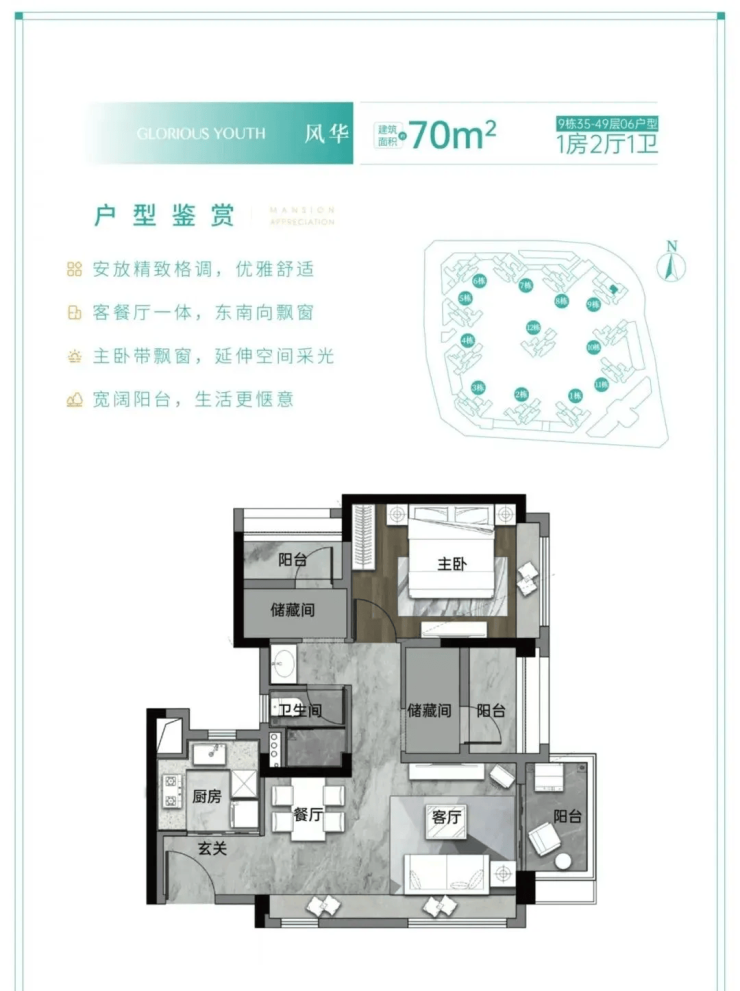 刚需两房户型:面积约70-80平方米,布局紧凑实用,无浪费空间。客厅连接阳台,保证室内采光和通风;主卧空间宽敞,配备飘窗,提升居住体验;厨房采用L型布局,操作便捷,满足日常烹饪需求。该户型总价低,仅70多万起,适合新婚小夫妻或单身白领,既能满足居住需求,又不会带来过大的经济压力。