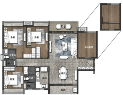 建面约122-143㎡改善型四房户型,是一步到位置业的优选产品,整体格局南北双阳台设计,空气对流循环,室内通风采光条件优越,四季保持干爽舒适。大面宽南向布局,客厅连接景观大阳台,直面社区园林景致,推窗即赏绿意风光;独立餐厅格局规整,可容纳多人聚餐,居家氛围感十足;卧室分布均衡,多飘窗拓展使用空间,主卧打造独立套房设计,配备步入式衣帽间、独立卫浴,私密性与专属感拉满,兼顾收纳与舒适,适配二胎家庭与三代同堂的居住需求,长远无需更换房源。