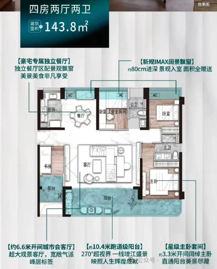 如果您追求极致的居住体验,那么145㎡的四房户型绝对不容错过。这是一个真正的豪宅户型,空间阔绰,功能完备。超大横厅设计,面宽惊人,采光通风效果极佳。客厅与阳台打通,形成了一个巨大的观景平台,270°环幕江景尽收眼底。