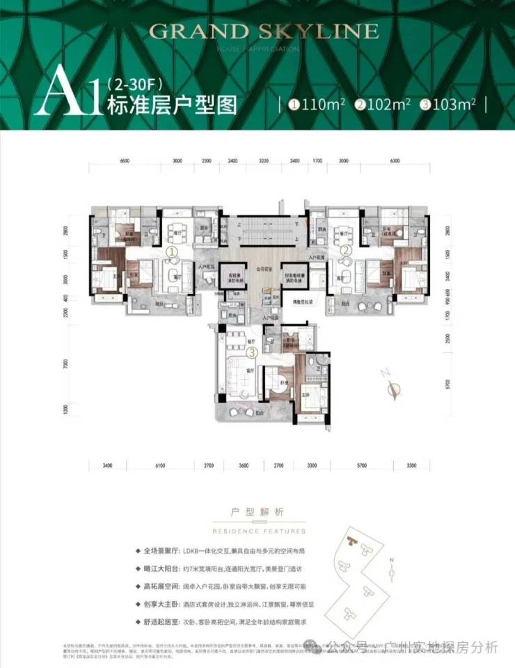 A1栋总高30层,采用2梯3户的设计,公摊面积小,得房率高。主推户型为102㎡、103㎡、109㎡的三房。这些户型方正实用,南北通透,采光通风俱佳。A1栋的位置优越,景观视野开阔,部分户型可以欣赏到美丽的江景。预计交付时间为2026年12月,精装修交付,让您早日入住新家。