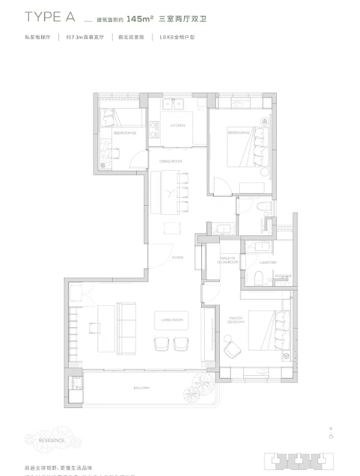所有楼栋均为16-17层纯板式小高层设计,专梯专户,低密度舒适人居美宅。在售户型多样,以145平方米起的大户型为主,具体户型如下: