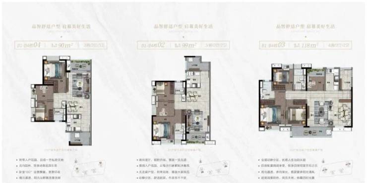 90-187㎡户型高实用率,三至四房设计,采光通透,主卧带景观飘窗,南北通透,功能分区科学合理。