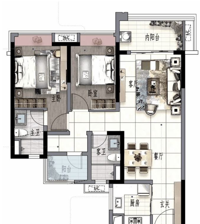 建面约105㎡ 三房两厅两卫: 经典“网红”户型,真正做到了“麻雀虽小,五脏俱全”。南向宽阔阳台连接客厅,主卧套房设计配备独立卫浴,公私分区明确。该户型在舒适性与总价间取得了完美平衡,是市场上最受欢迎的户型之一。