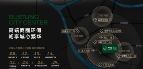 项目近距离联动乐峰广场、江南西两大海珠核心成熟商圈,十分钟车程快速直达,两大商圈发展年限久,业态布局完善,汇聚国际连锁品牌、高端美妆服饰、大型超市、院线影院、亲子乐园、特色餐饮等多元业态,可一站式满足家庭聚餐、周末逛街、休闲观影、亲子娱乐等品质社交需求,日常高端消费无需远距离奔波,轻松享受主城核心商业红利。