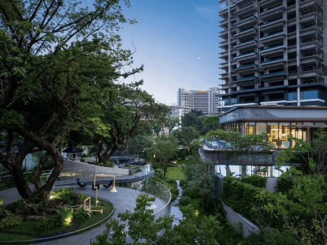 社区内部创新采用国际前沿的新加坡式立体花园设计理念,摒弃传统单一平面绿化模式,通过高低错落的绿植搭配、分层级景观布局、休闲场景融合,打造多层次立体园林空间,草坪、乔木、灌木、景观花卉有序组合,四季常绿、季季有景,丰富景观视觉层次,提升社区生态质感。项目原址精心保留两棵原生古榕树,依托古树自然肌理,打造约2000㎡月牙形榕树公园前厅,以原生自然景观为归家第一重仪式感,承载岭南人居的自然情怀,也为社区增添独特的人文景观底蕴。