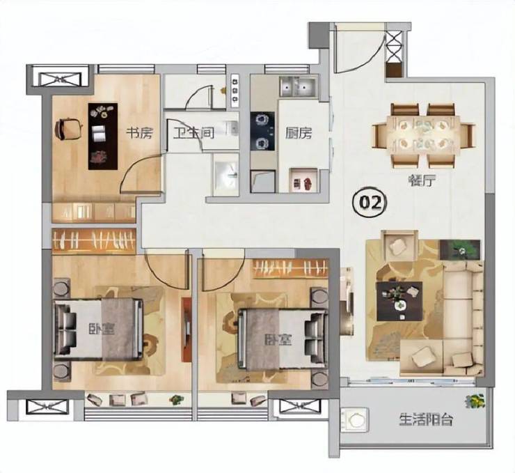 三房两厅95㎡户型:南北对流设计,全新升级打造全屋高定奢装交付,适合年轻夫妇或小家庭居住。