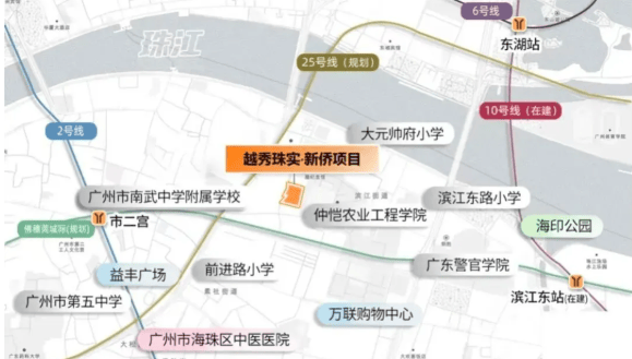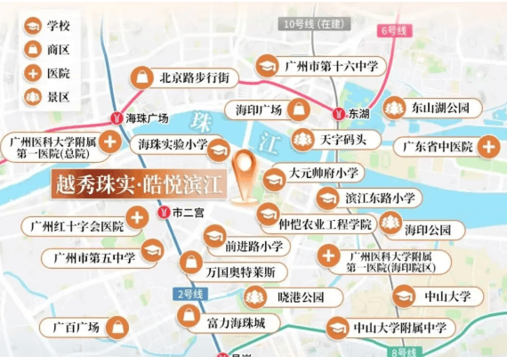 轨道交通方面,项目距离地铁2号线市二宫站约1.2公里,6号线团一大广场站约1.4公里,1站即达江南西商圈与海珠广场,2站畅达公园前、昌岗等城市枢纽。更值得期待的是,地铁10号线滨江东站(在建)距离项目约1.7公里,未来通车后,1站直达东湖,3站直抵广州大道中,无缝衔接城市东西发展动脉。