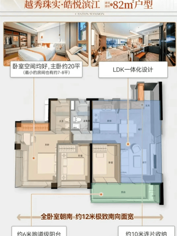 82㎡三房:采用LDK一体化布局,搭配约6米跑道式阳台(阳台占比达新规上限20%),三间卧室均朝南,实用率高达110%-120%;