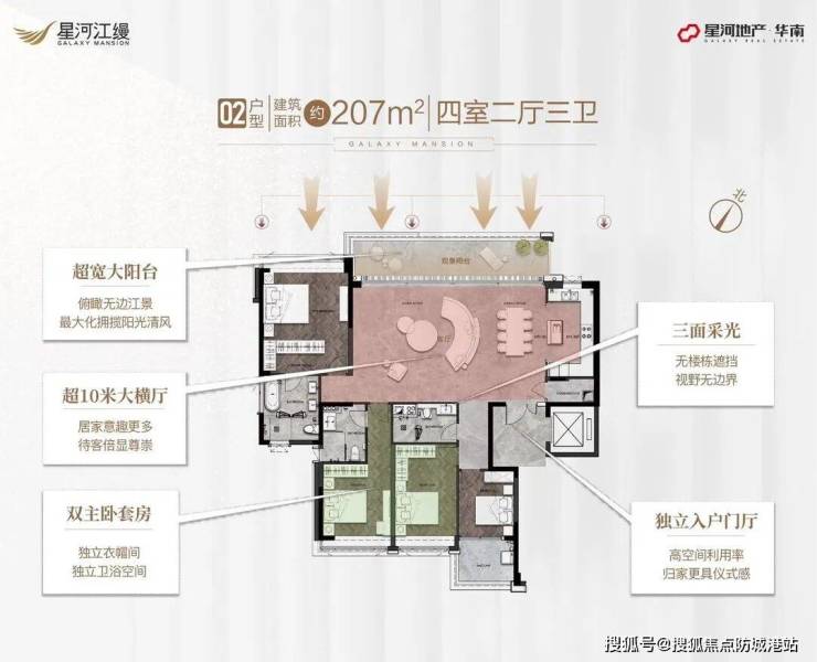 179平方米四房:LOW-E玻璃、LDKB一体化设计,超宽大阳台,双主卧套间,高得房率,三卫浴空间,均为项目产品力的高调炫技。