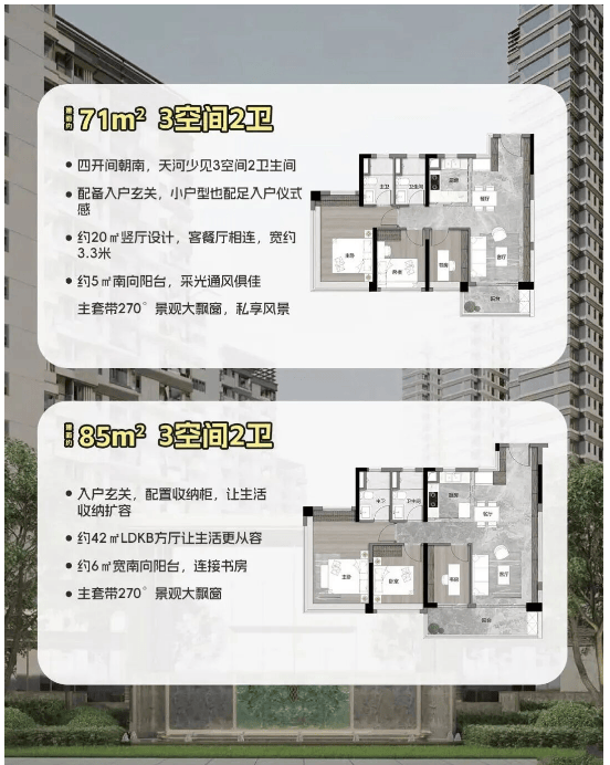 二期推出的“峯荟”组团主打全南向的新规产品,面积段从71平方米至144平方米不等,适合不同家庭结构的需求。所有户型均采用现代设计理念,注重空间利用效率和居住舒适度,配备高端精装修标准,部分户型还享有270°景观大飘窗和超广角视野,进一步增强了居住体验。
