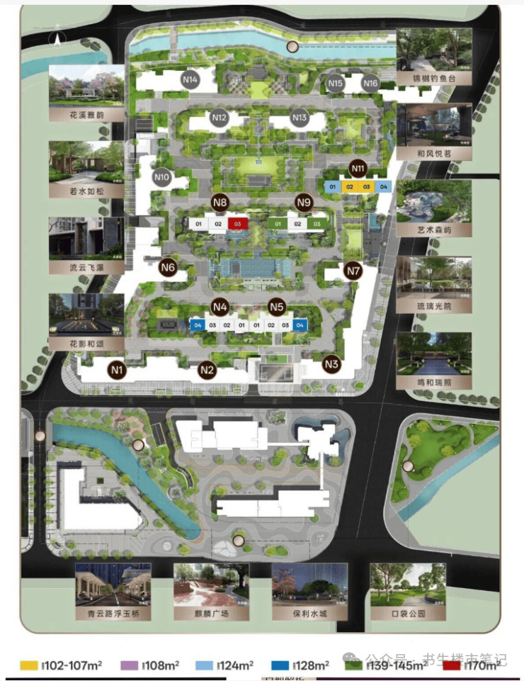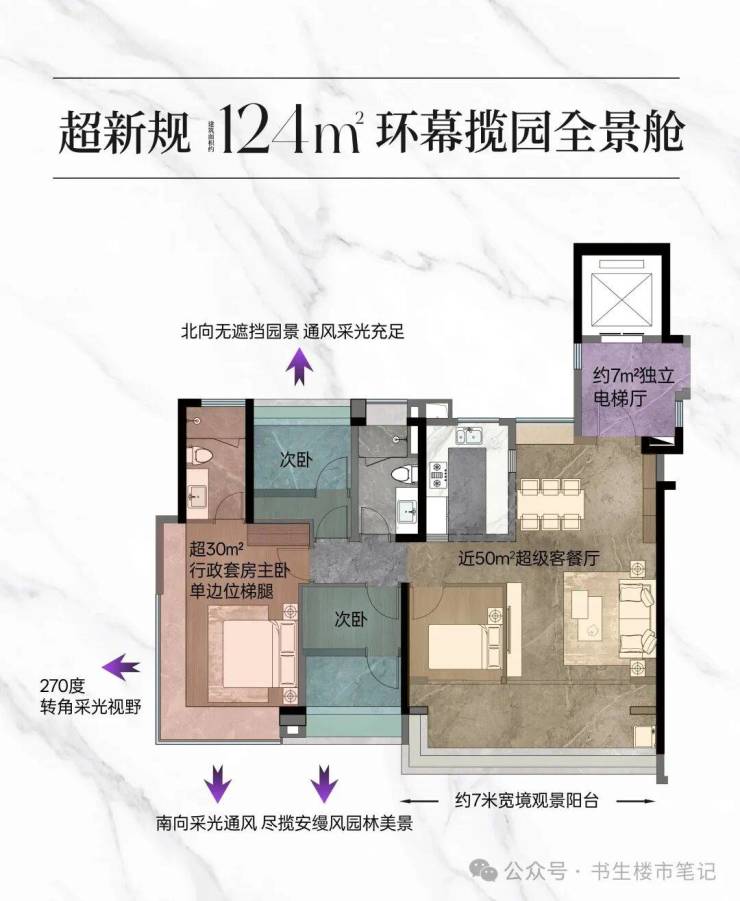 4. 超新规产品设计:纯南向全板式楼盘,100%南北对流、100%四开间朝南,约55米超阔楼间距,115%-125%超高使用率,107-170㎡改善四房,适配各类改善家庭需求。
