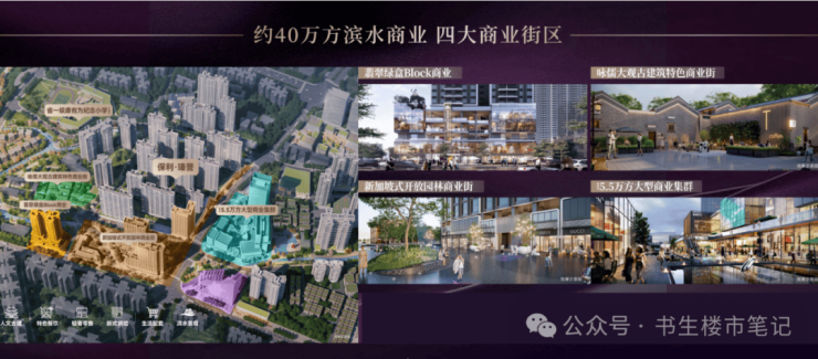 项目所在板块规划有约40万方滨水商业集群,打造四大特色商业街区,包括新加坡式开放园林商业街、迷你玻璃盒子商业综合体、古建筑特色风貌街区、约5.5万方精品商业集群,兼具烟火气与时尚品味,24小时步行可达,为业主打造环绕式便利生活。