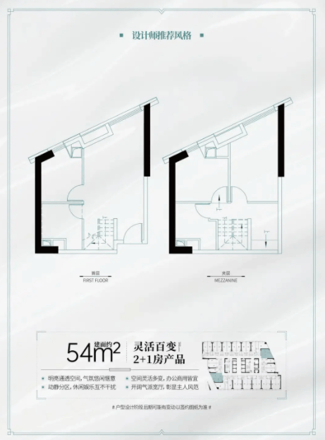 该户型为项目特色产品,占据临江优势位置,4.5 米挑高空间,可做分层设计,部分户型为双钥匙格局,空间利用率大幅提升。一层可用于居住、休闲,二层可用于办公、收纳,也可分割成两个独立空间,分别出租或自住,适配居住、办公、投资等多种场景。百变的空间设计,稀缺的临江属性,让该户型成为市场上的热门产品,无论是自住还是投资,都拥有极高的价值。